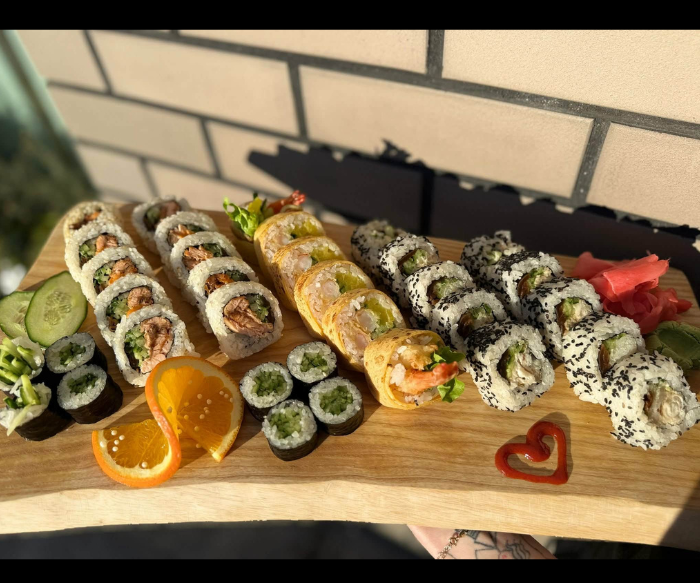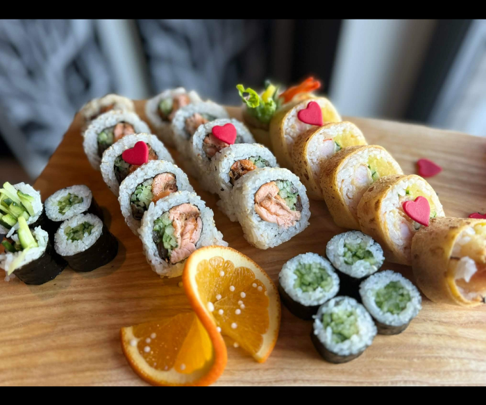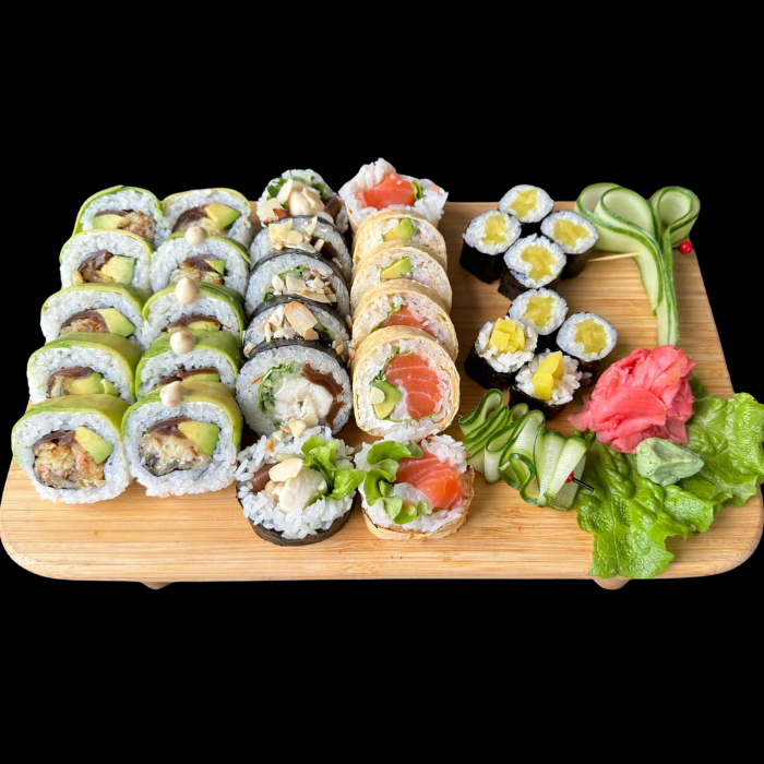California ebi tempura - 10 szt Tamago łosoś surowy z liczi - 6 szt Futomaki pieczony łosoś - 6 szt Hosomaki tykwa w tempurze z tatarem z łososia - 8 szt