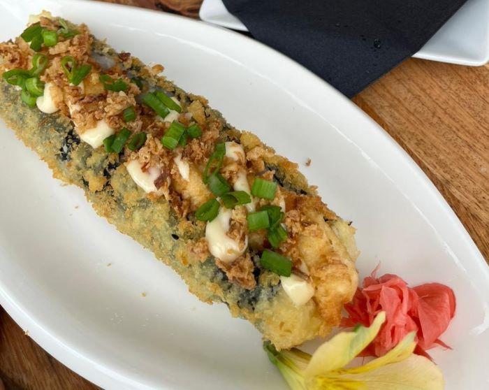 HOT DOG SUSHII CHRUPIĄCA KREWETKA, SOS MAJO, SZCZYPIOREK, KAWIOR